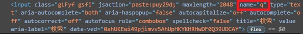 検索欄のコードを確認すると、name属性がqになっているのがわかると思います。