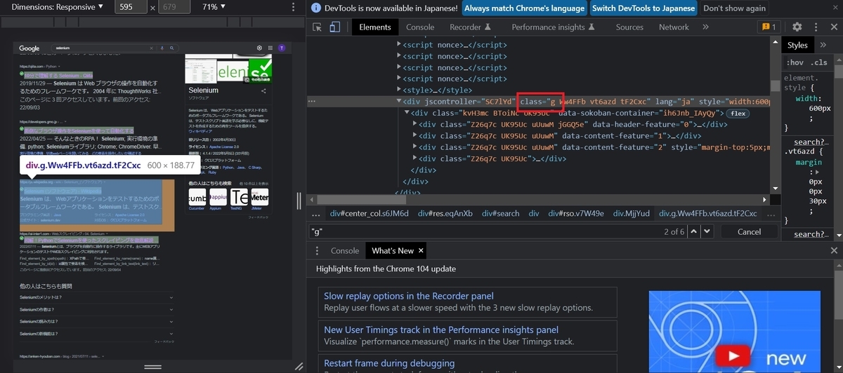 HTMLの情報を見ていくと、各ページの単元はclass="g"ごとにまとまっていることがわかりました。よって、find_elements()を用い、クラス名"g"の要素を取得します。(※class名がスペースで区切られていますが、これは複数のclass属性があることを指しています。)