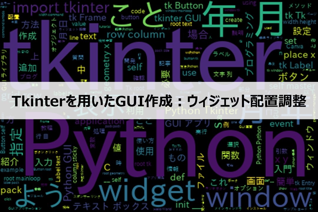 tkinterを用いたGUI製作として、ウィジェット配置の方法について紹介しました。ウィジェット・オブジェクトを配置するのはGUI製作の基本となりますので、ぜひ覚えましょう。