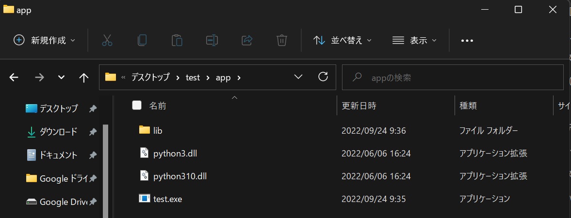 例は以下の様になります。以下ではtest.pyをexe化して。それらがappフォルダに格納されます。